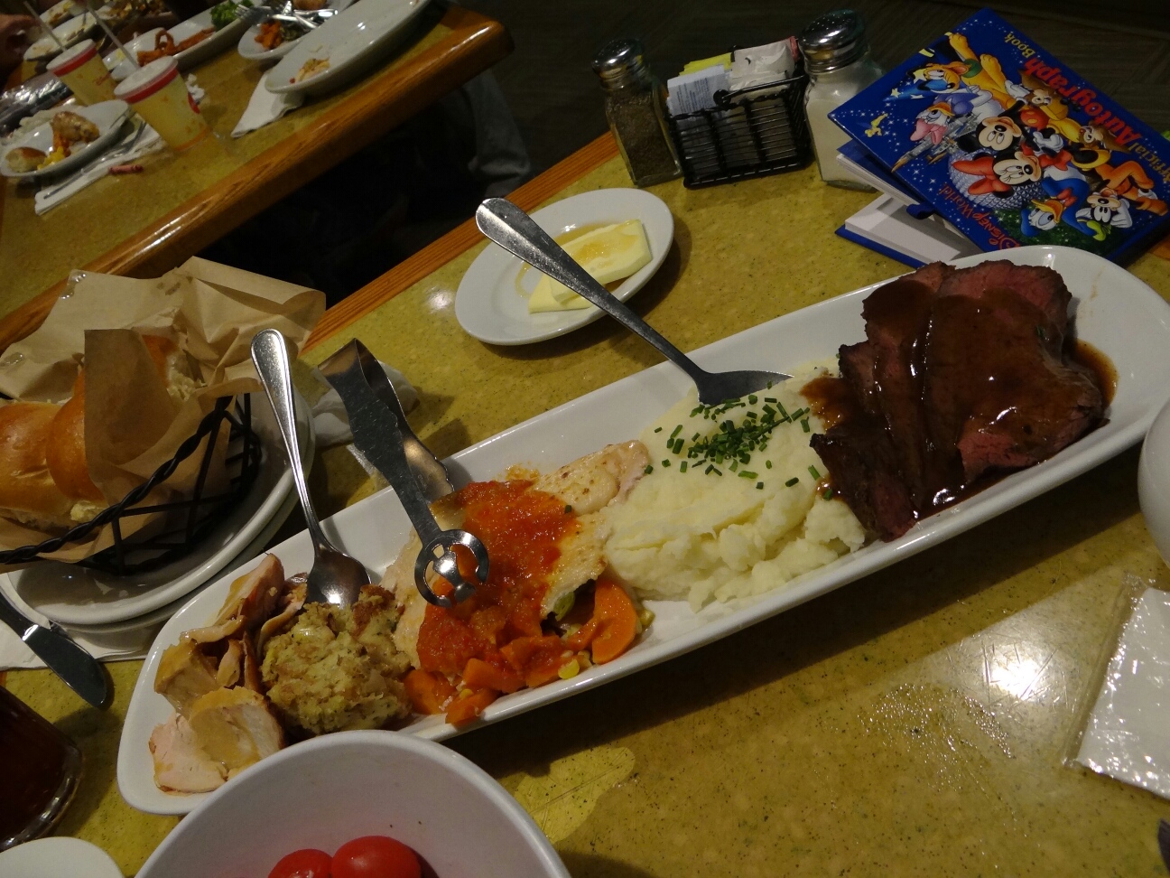 2時からフェスティバルオブライオンキング。 よかったけど、私はニモの方が好きです。 ここらへんから雨。。 カリリバーに並ぶも、アトラクションも雨待ちになってしまい。。 しばらく待ちましたが寒いし、、諦めました(´・∀・`) 今日は暑い予報だったのになー! 残念でした。 帰りにサファリルックのミキミニを買ってホテルに戻ります。 今日の夕御飯はガーデングリルです٩( ''''ω'''' )و 予約時間になっても相変わらずの雨で、、 キャンセルしちゃおうかとmy disney experienceを見てみたら もうキャンセル出来なくなってました(´ヮ`;) 時間ギリギリだったので、急いで向かったのですが20分ほど遅刻、、 でも、無事入れてくれました~ ここ食べ放題なんですが、お昼にタスカーでお腹一杯だったので あまり入らず(´・∀・`) 1日に2つ予約は厳しかったかもです(´・ω・`) まずはプルートがやってきましたー 続いてミッキー☆゛ そして今回初のチップンデールー! まずはデール。 自分のグッズを持っていないことに悲しんでいたようでしたw チップも怒っているようでしたw 閉店間際の時間でゲストが少なかったからでしょうか、 プル3回、ミキ・チデ2回回ってきました~(♡´艸`) たくさん残してしまって勿体なかったので、to-goを聞いてみたのですがダメでした。やっぱり食べ放題ですしね(>ω<) 今日はこれで終了! お部屋に戻って、洗濯とかしなきゃです( ''ч'' )